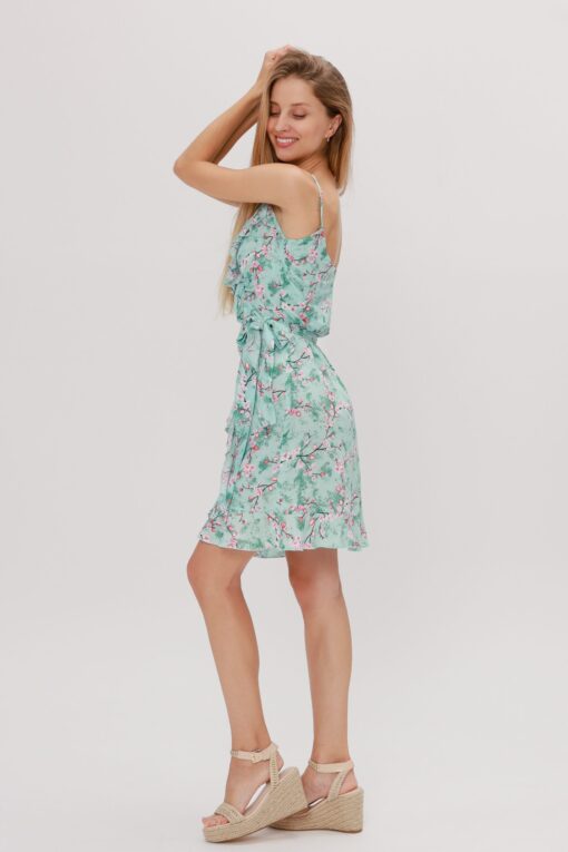 Embrace a fresh look with this light green almond print wrap mini dress, featuring thin straps and charming ruffles at the bust and skirt. Designed to be bra-friendly and made from 100% viscose, it ensures both comfort and style. Tailored to your exact measurements and height, it also has a matching Almond Bliss Dress With Dots for your daughter (1-5 years) for a delightful coordinated outfit.