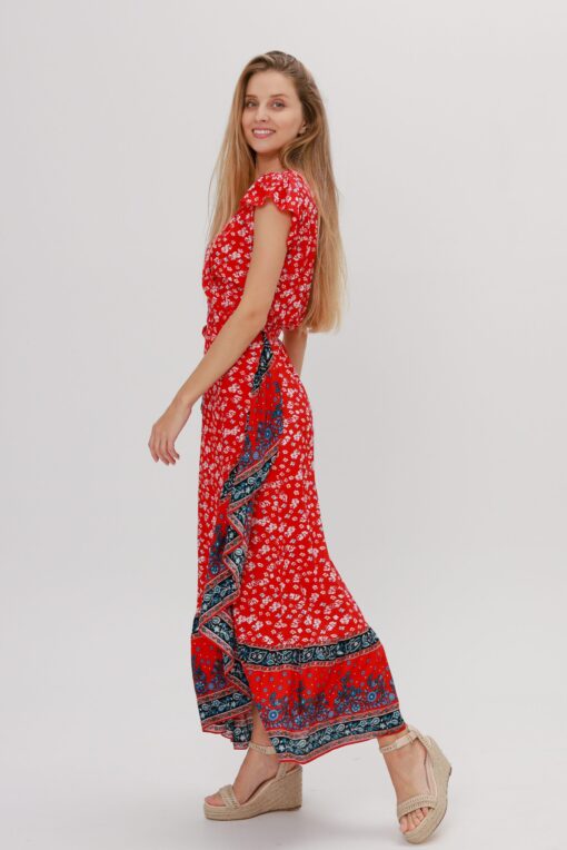 Step out in style with this red floral print wrap dress featuring short flutter sleeves and a flattering waist tie. Designed to be bra-friendly and crafted from 100% viscose, it offers both comfort and elegance. Custom-made to your exact measurements and height, this dress also has a matching Red Floral Dress for your daughter (1-5 years) for a charming mother-daughter duo.