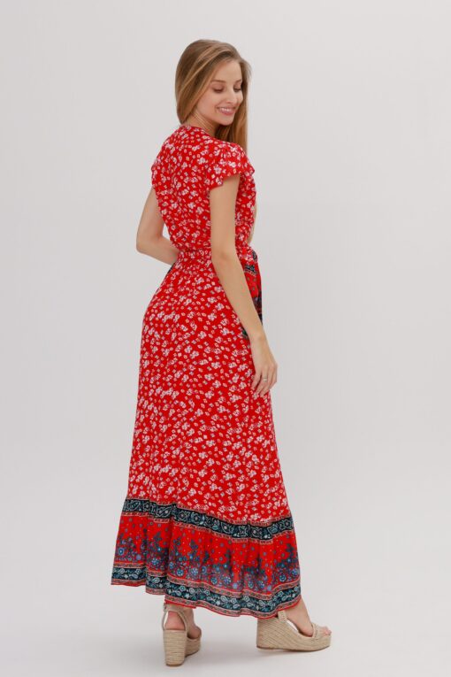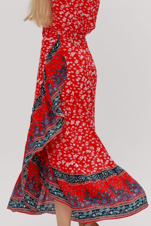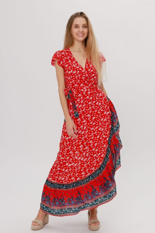 Step out in style with this red floral print wrap dress featuring short flutter sleeves and a flattering waist tie. Designed to be bra-friendly and crafted from 100% viscose, it offers both comfort and elegance. Custom-made to your exact measurements and height, this dress also has a matching Red Floral Dress for your daughter (1-5 years) for a charming mother-daughter duo.